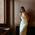 Look your best on your special day with the elegant WAVE Gown! Draped satin dress features a waterfall collar and low back for a timeless and classic look. Crafted from a luxurious and flowing satin fabric. With a pull-on style and full lining, you'll be able to show off your beautiful figure without compromising on comfort.