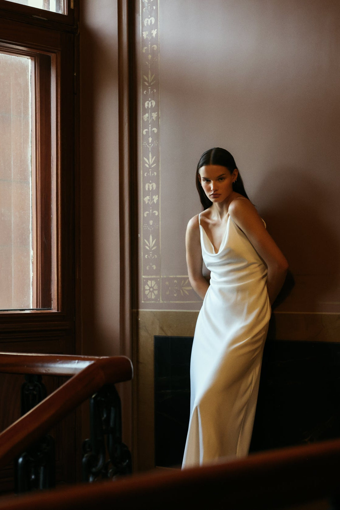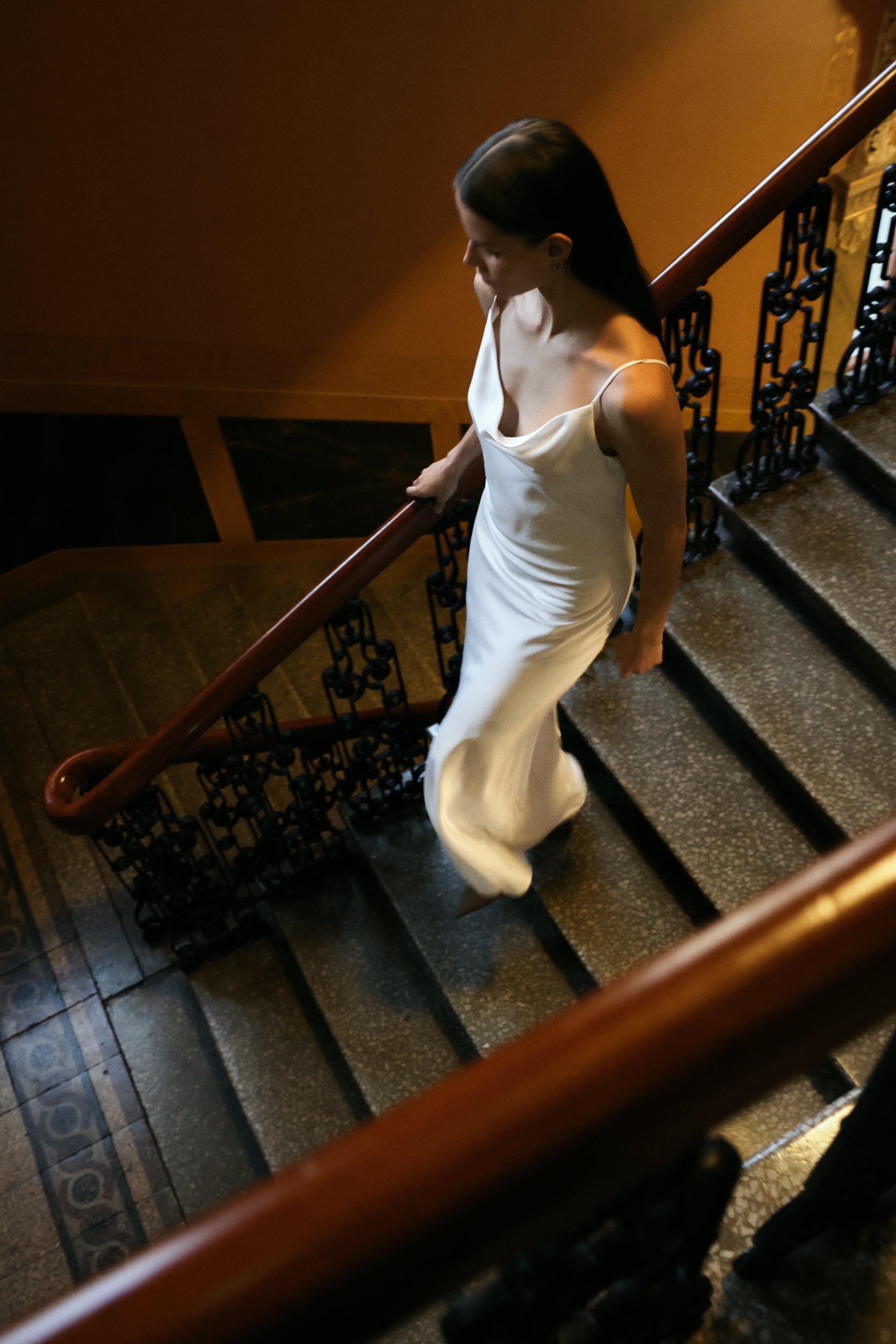 • Draped strap gown cut from a flowing satin fabric