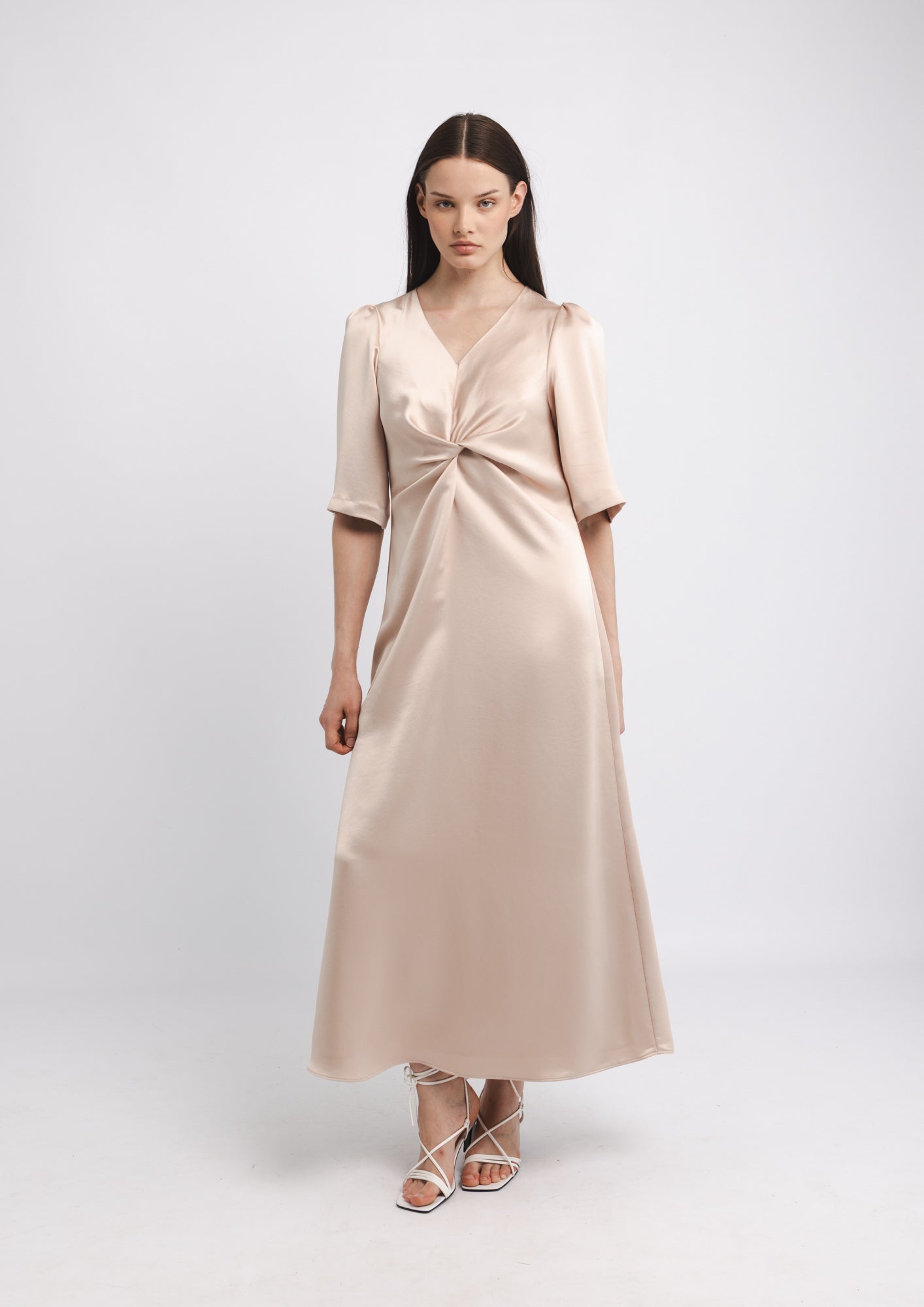 The LAURELLE MIDI DRESS is a sophisticated piece built on structured satin for lasting shape and elegance. A front knot detail and V-neckline create visual interest, while quarter-length sleeves provide seasonal versatility. The lined bodice ensures comfort and opacity, with a discreet back zipper for a seamless silhouette. Ideal for both professional and occasion wear, this midi dress pairs timeless construction with modern design details.