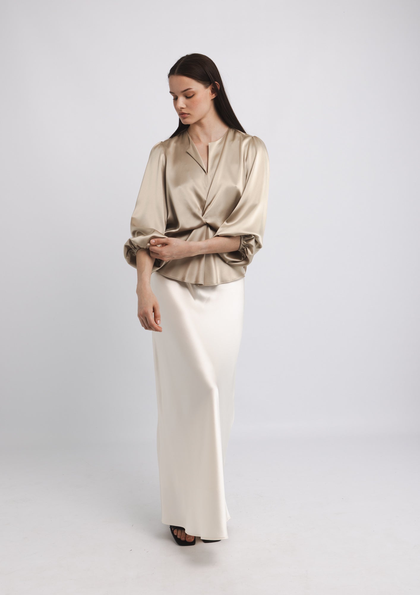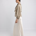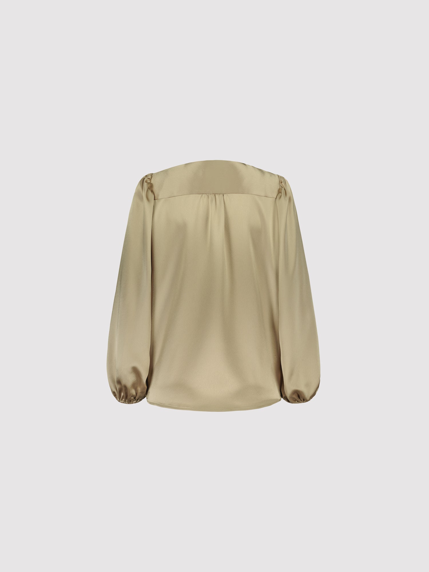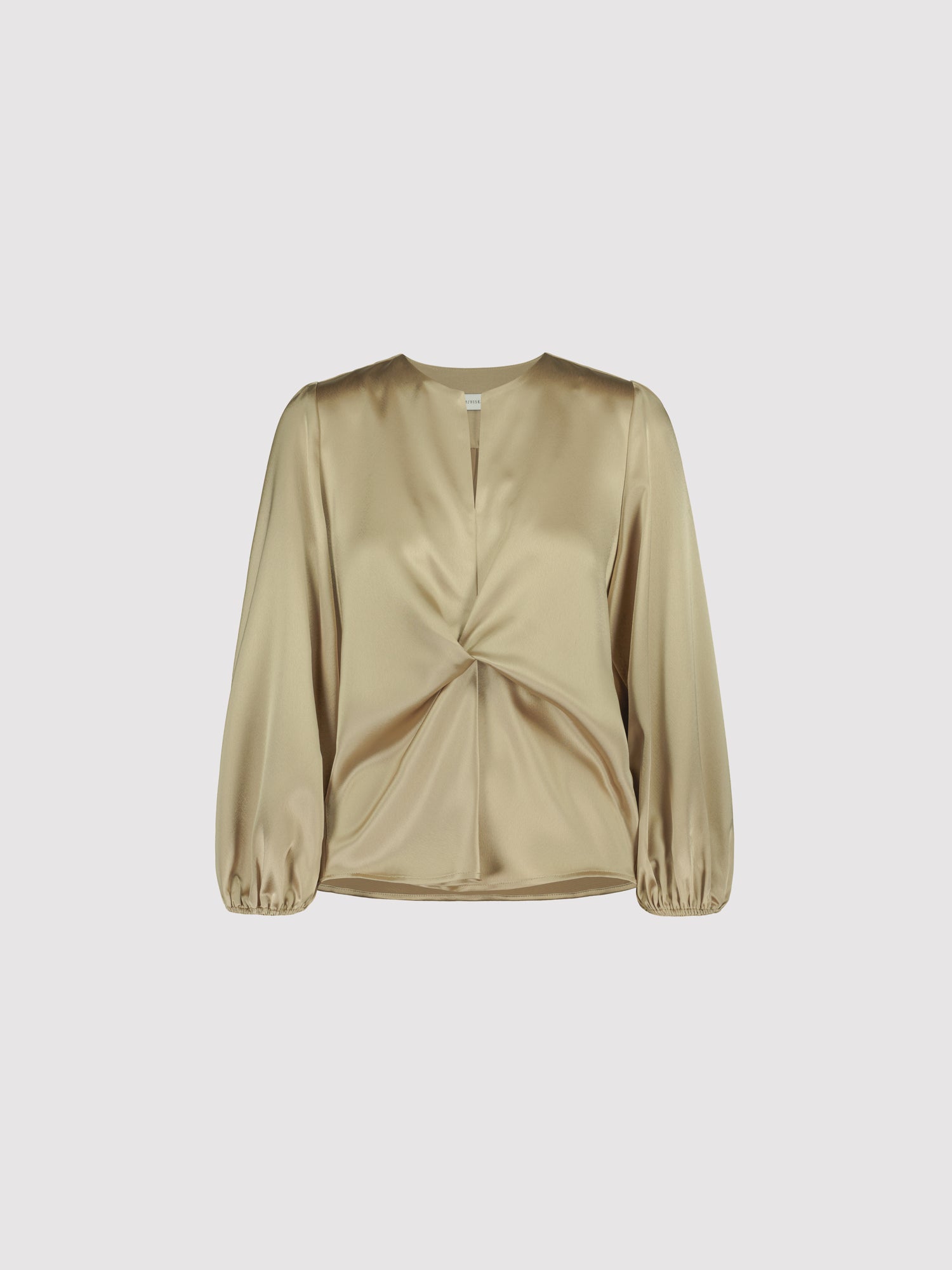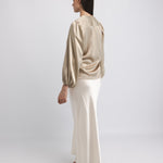 The SUE BLOUSE is a sophisticated wardrobe essential that combines refined elegance with thoughtful design details. Crafted from luxurious satin, this blouse features a distinctive knot detail at the front that adds visual interest and dimension to your silhouette. The round neckline is finished with a subtle front slit, creating a flattering frame for the face while maintaining a polished aesthetic. Long sleeves with elasticated cuffs provide a tailored fit that transitions seamlessly from professional settings to elevated casual occasions. The fluid drape of the satin fabric creates a graceful movement, while the neutral latte tone offers versatile styling possibilities that pairs effortlessly with tailored trousers, skirts, or layered pieces.