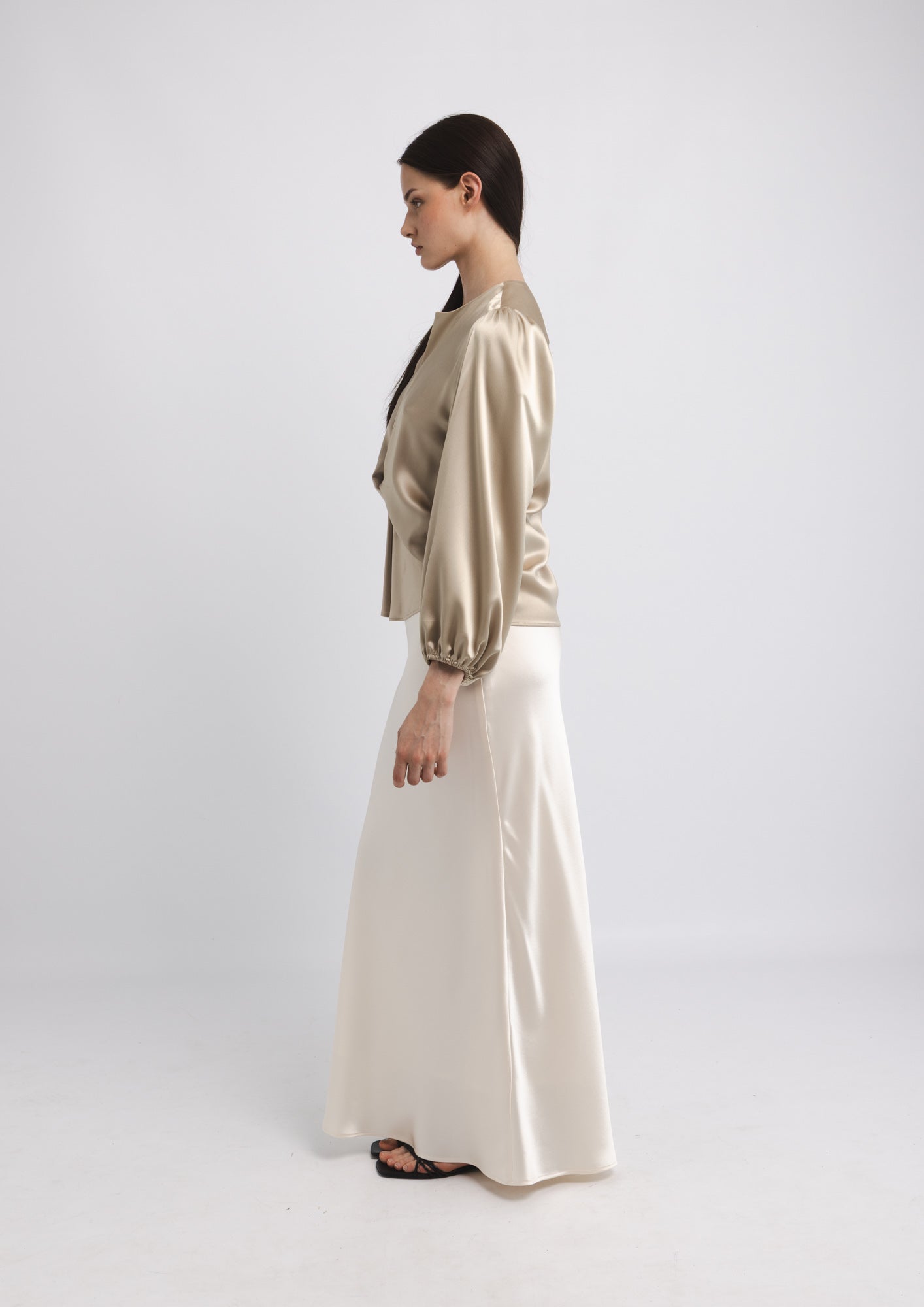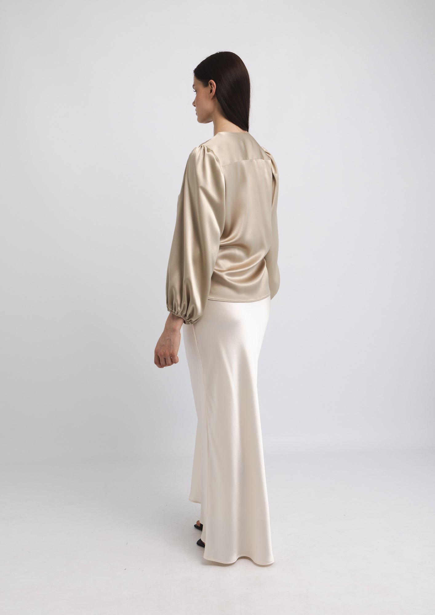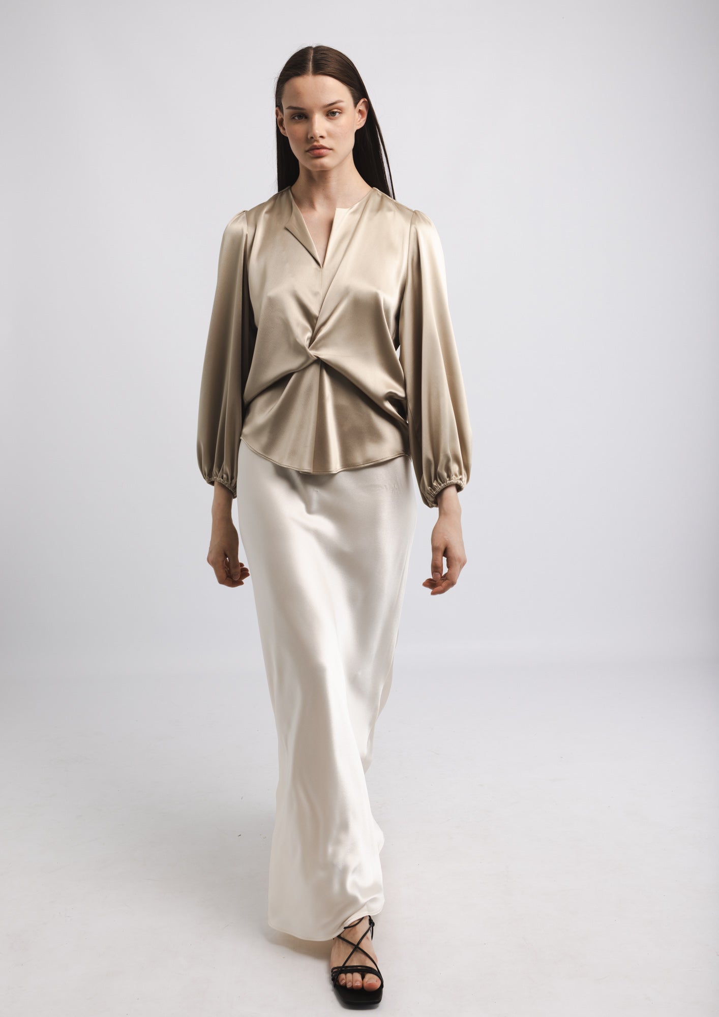 The SUE BLOUSE is a sophisticated wardrobe essential that combines refined elegance with thoughtful design details. Crafted from luxurious satin, this blouse features a distinctive knot detail at the front that adds visual interest and dimension to your silhouette. The round neckline is finished with a subtle front slit, creating a flattering frame for the face while maintaining a polished aesthetic. Long sleeves with elasticated cuffs provide a tailored fit that transitions seamlessly from professional settings to elevated casual occasions. The fluid drape of the satin fabric creates a graceful movement, while the neutral latte tone offers versatile styling possibilities that pairs effortlessly with tailored trousers, skirts, or layered pieces.