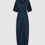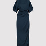 Elevate your formal attire with the ERIKA EVENING DRESS in sophisticated dark blue. Crafted from premium structured satin, this evening dress combines elegant design with meticulous tailoring. Strategic pleating along the side seam and center back creates a flattering silhouette while enhancing movement. The short sleeves offer versatile coverage, complementing the dramatic long wraparound hem that adds architectural interest to your stride. This timeless evening piece transitions effortlessly from cocktail events to formal galas, ensuring both sophistication and comfort throughout your special occasions.
